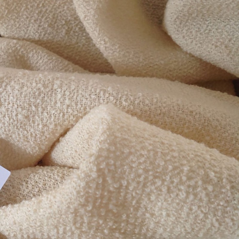 Bouclette écrue, belle à regarder ! Tissu en laine offrant une texture bouclée apportant chic et caractère.